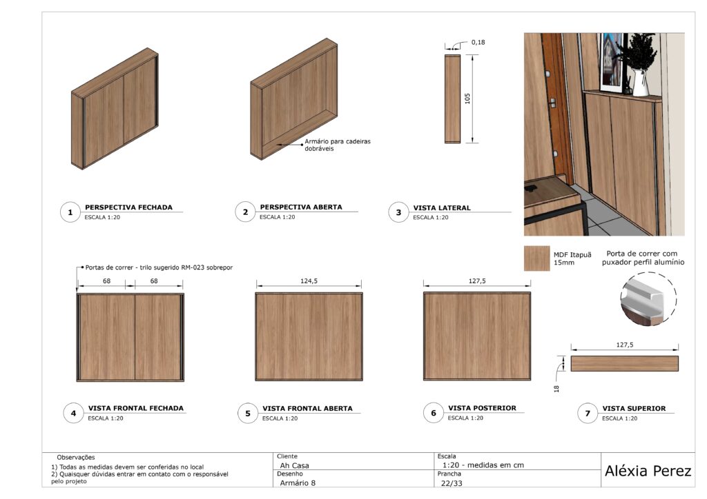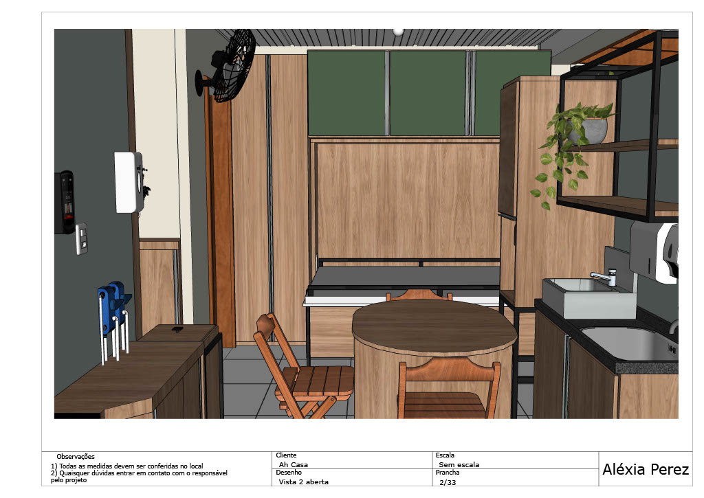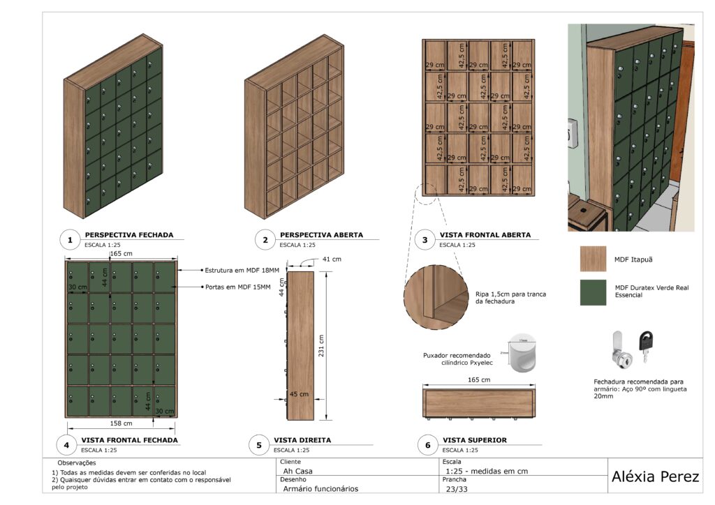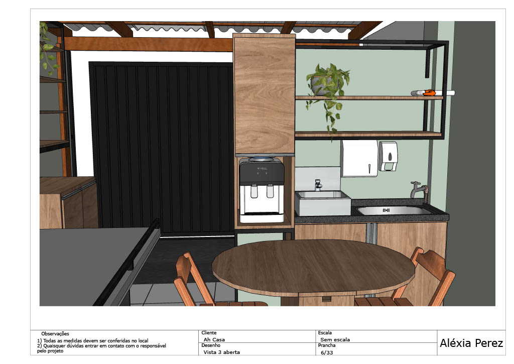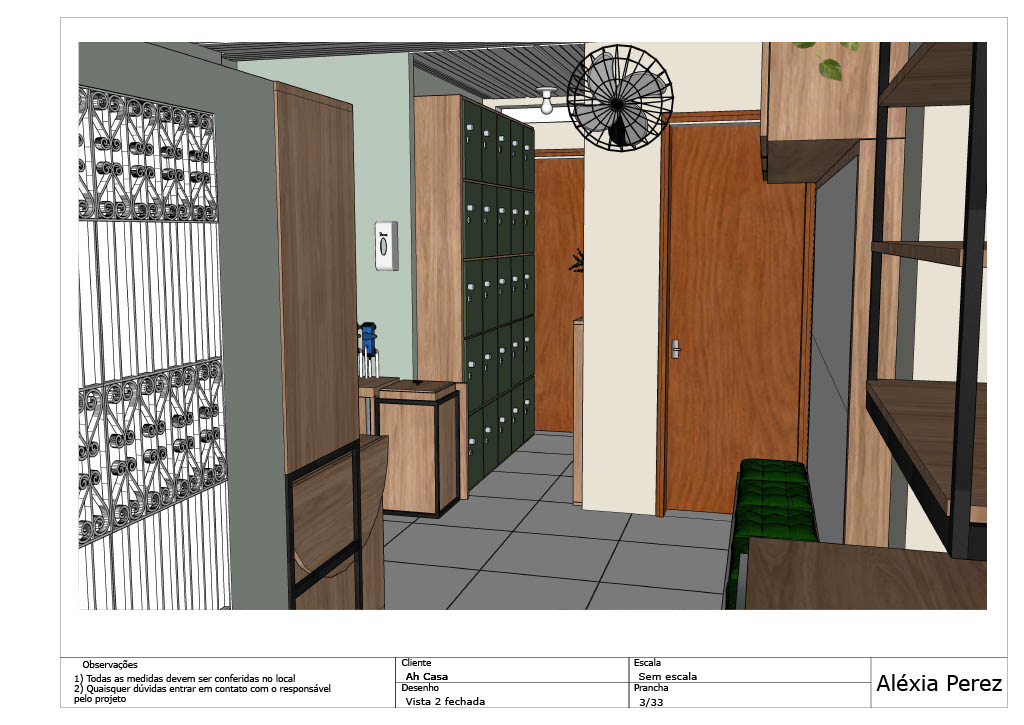 Abaixo compartilho um projeto que desenvolvi para uma área de funcionários de uma empresa. Trata-se de um ambiente pequeno, que é utilizado pelos colaboradores nos horários de intervalo e almoço, além de ser utilizado também para guardar parte do estoque utilizado pela organização. Neste ambiente as pessoas podem fazer suas refeições, descansar e guardar seus pertences. Foi solicitado que o projeto tivesse diversos armários para comportar esta demanda de objetos e para que os fornecedores não precisem atravessar o ambiente para descarregar as mercadorias. Os materiais foram pensados para seguir a estética do estabelecimento, trazendo também para os colaboradores a valorização e aconchego das demais áreas decoradas já existentes na empresa.